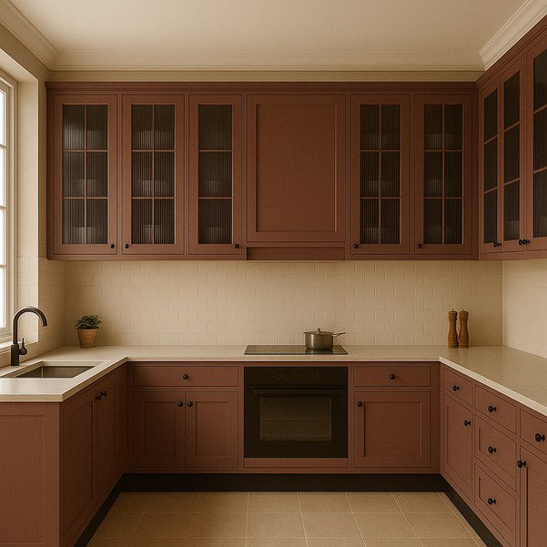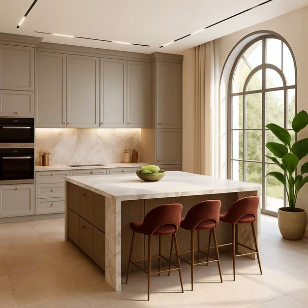 For a bold, Contemporary touch, explore lacquered Glass, metallic accents, and Stone-inspired surfaces that add Depth and Sophistication to your Kitchen.